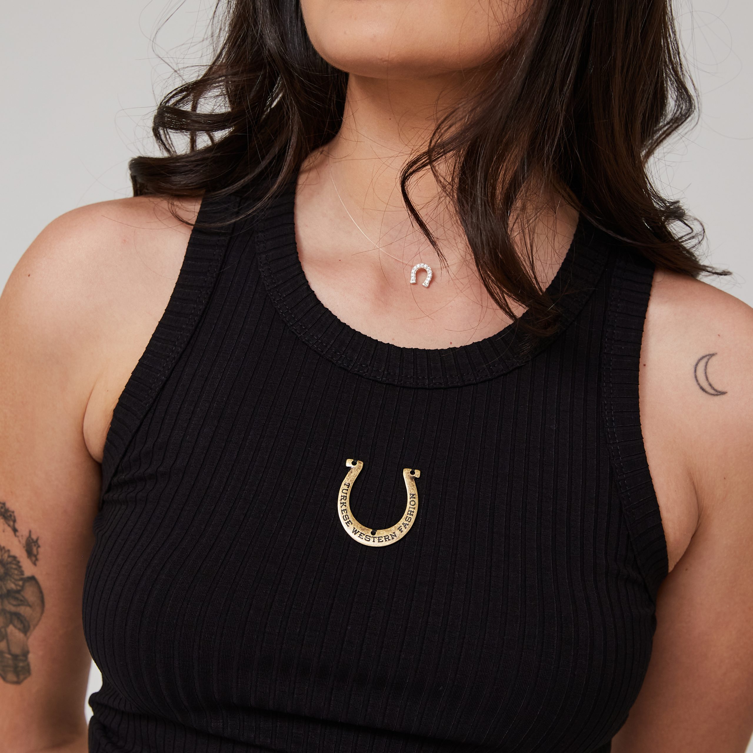 Regata com a modelagem mais justa, shape slim, decote redondo e aplicação de ferradura em metal Zamac Tecido: 92% algodão + 8% elastano Modelo está…