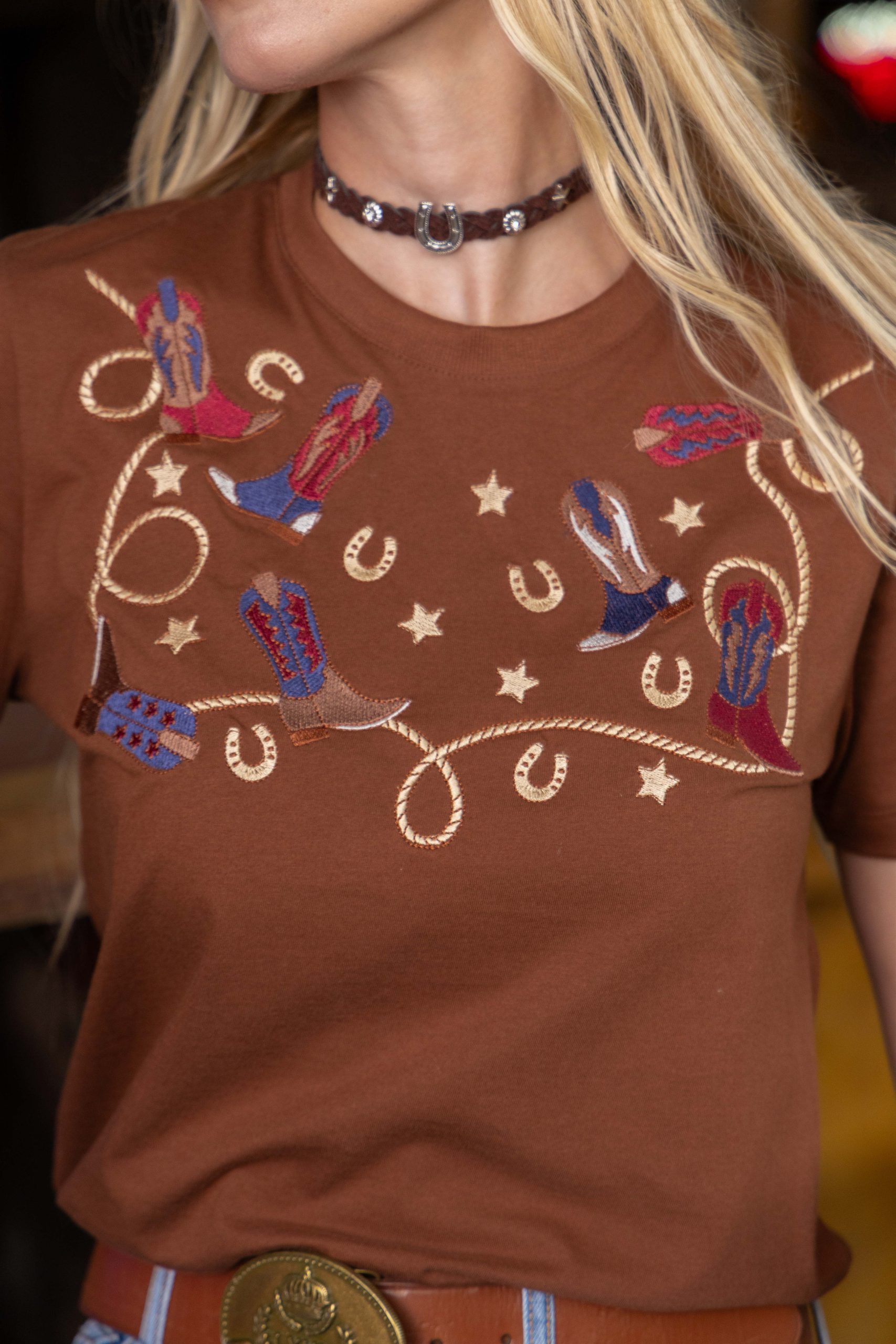 T-shirt com bordado frontal de botinhas Tecido: 100% algodão A modelo esta usando tamanho P.