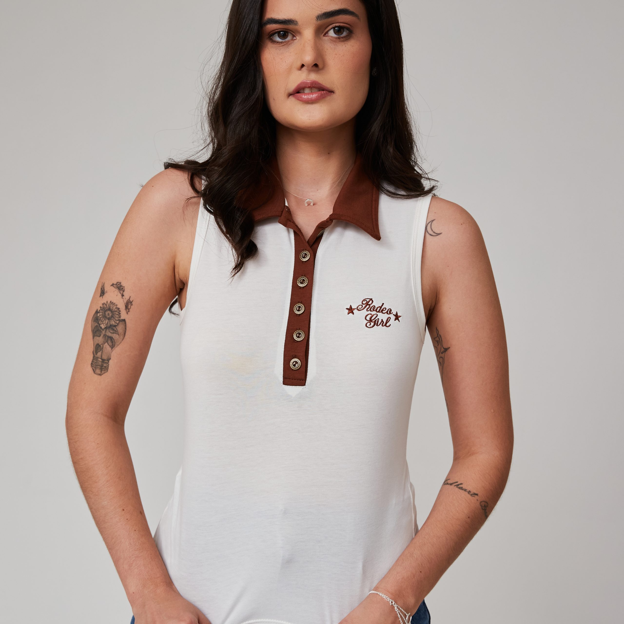 Regata cavada gola polo com detalhe bordado, abertura e fechamento composto por 6 botões, modelagem um pouco mais curta e soltinha Tecido: 96% algodão |…