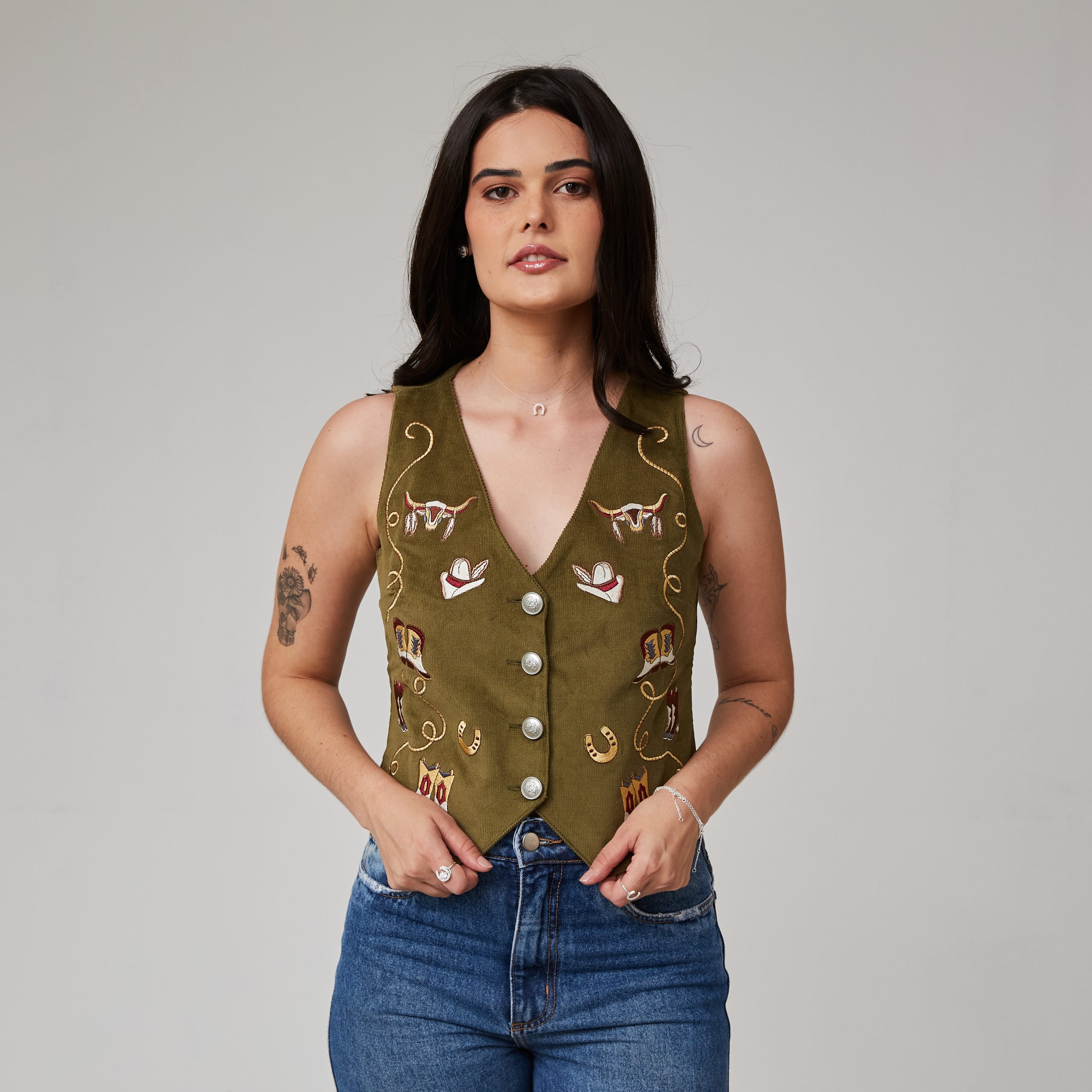 Colete em veludo cotelê com bordado frontal, fechamento em botão e tecido duplo para maior estrutura. Tecido: 97% algodão | 3% elastano Modelo veste tamanho P.