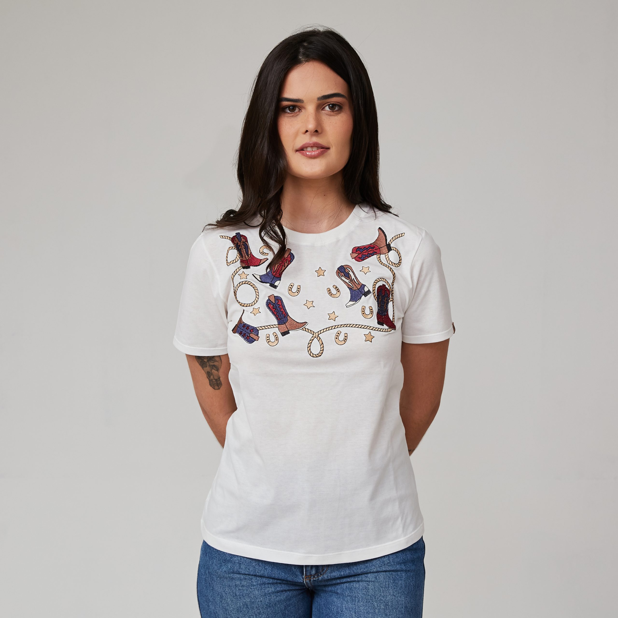 T-shirt na cor branca com bordado frontal de botinhas Tecido: 100% algodão A modelo esta usando tamanho P.