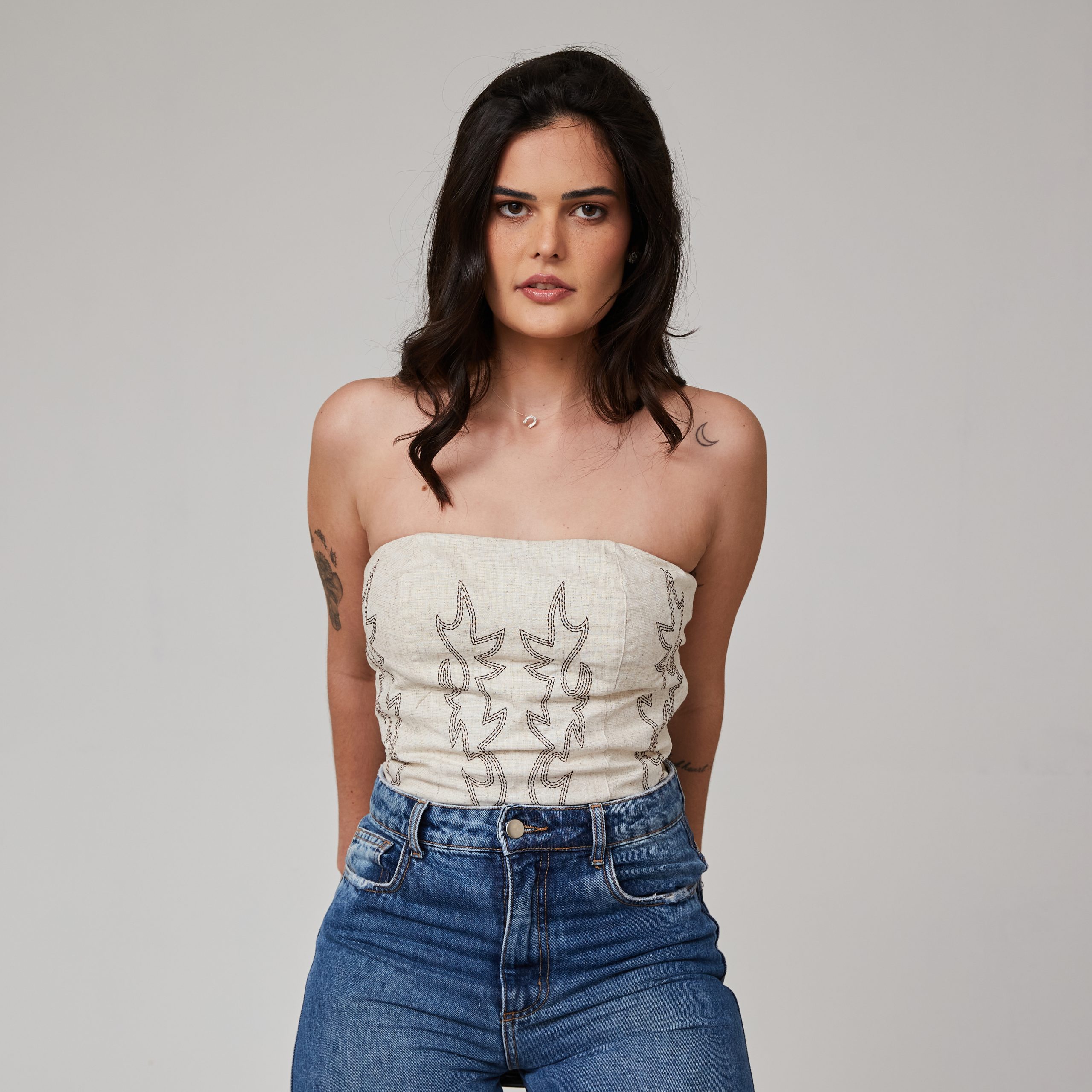 Corselet com bordado frontal, zíper lateral e lastex nas costas. Tecido: linho premium com 3% de elastano para maior conforto Na foto a modelo usa…