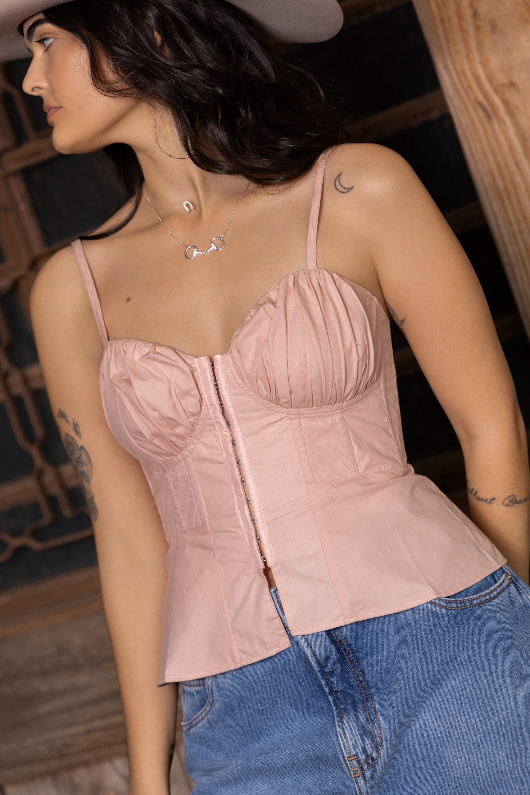 Blusa de alcinha no comprimento cropped, com fechamento frontal em colchetes, possui lastex nas costas e alça ajustável.