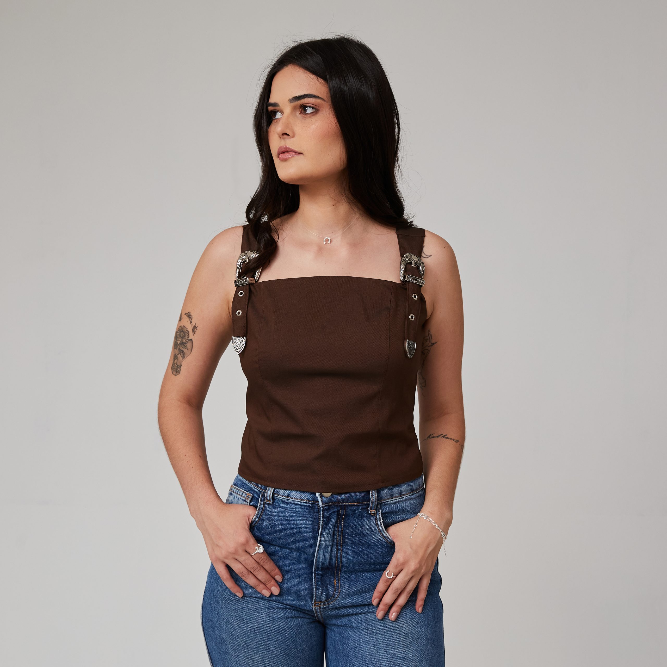 – Cropped com a modelagem estruturada; – Recorte no busto; – Tecido duplo e lastex nas costas; – Possui zíper lateral e aplicação de tachas.…