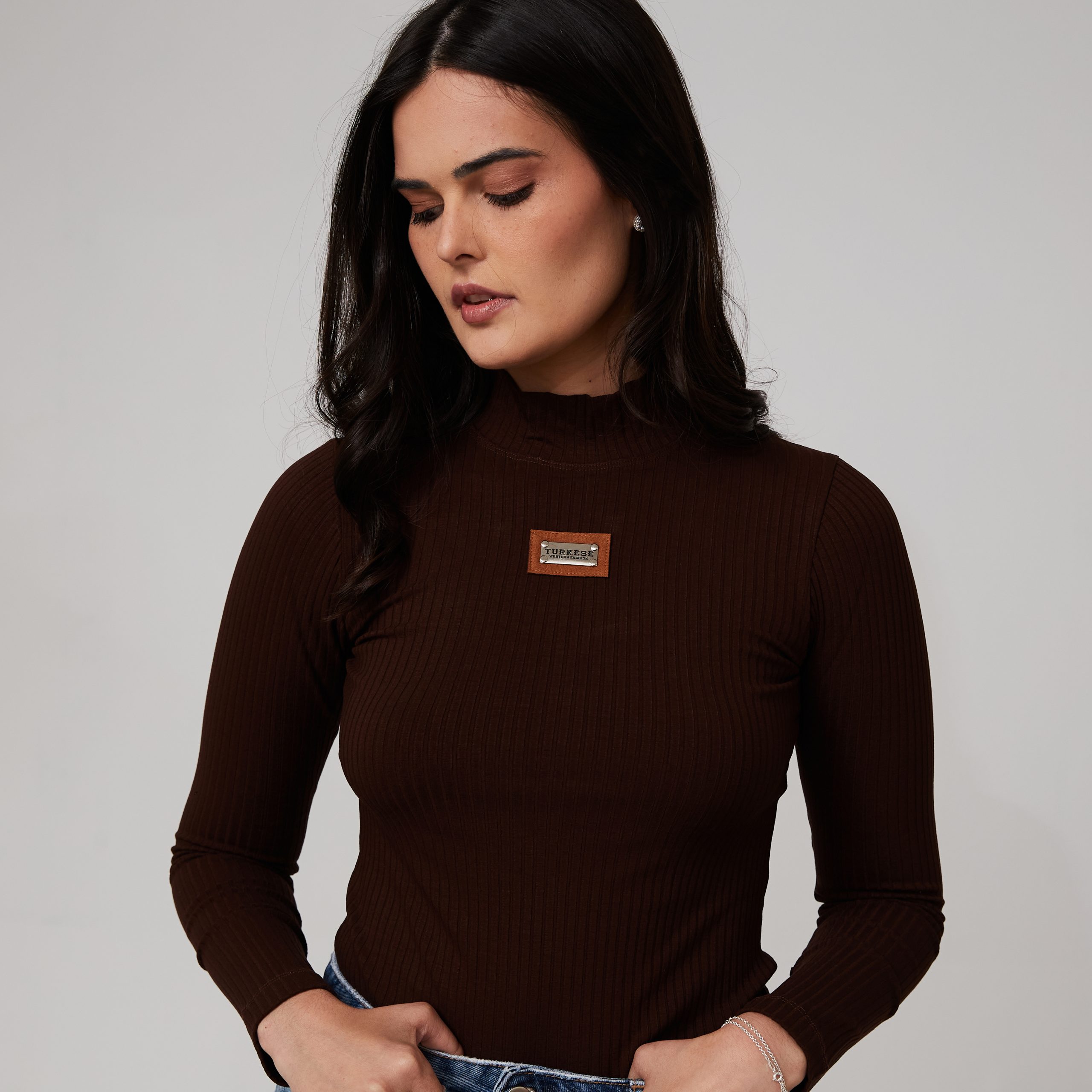 Blusa em malha canelada com gola alta e aplicação de patch com logo marca na parte frontal.
