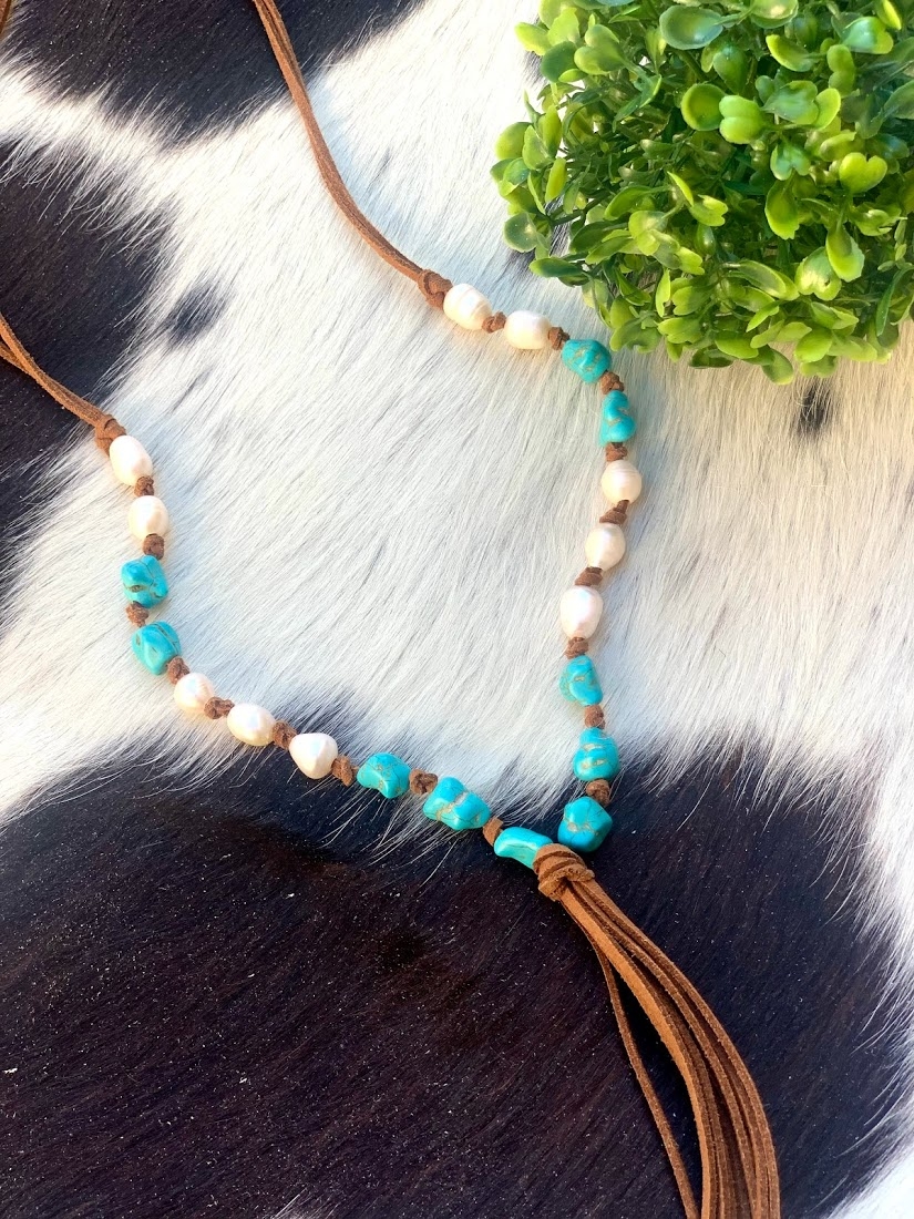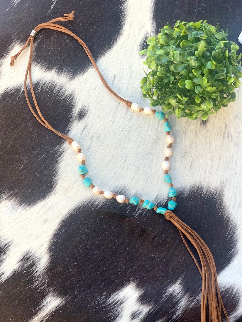 Colar em couro com pedras turquesas, tamanho regulável.