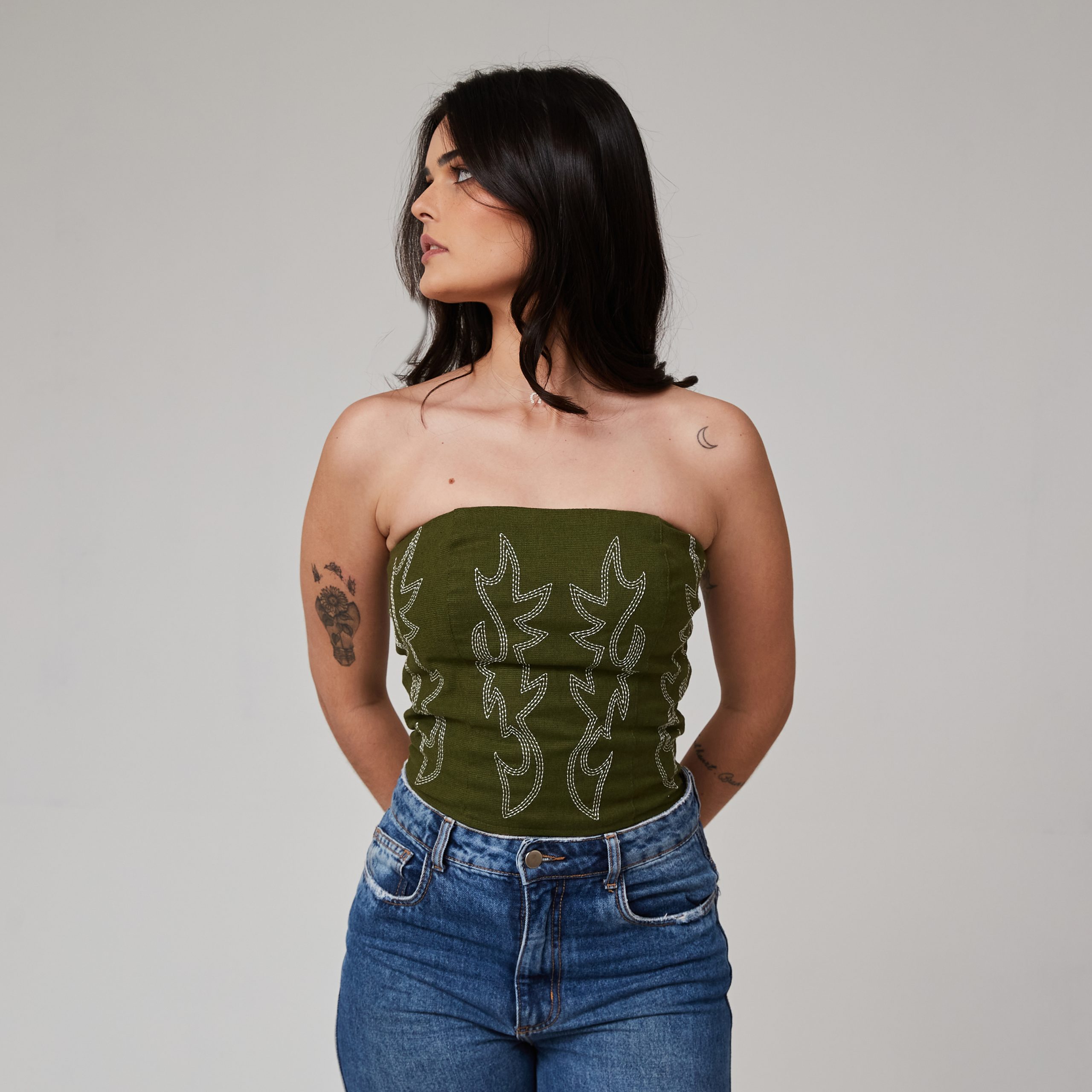 Corselet com bordado frontal, zíper lateral e lastex nas costas.