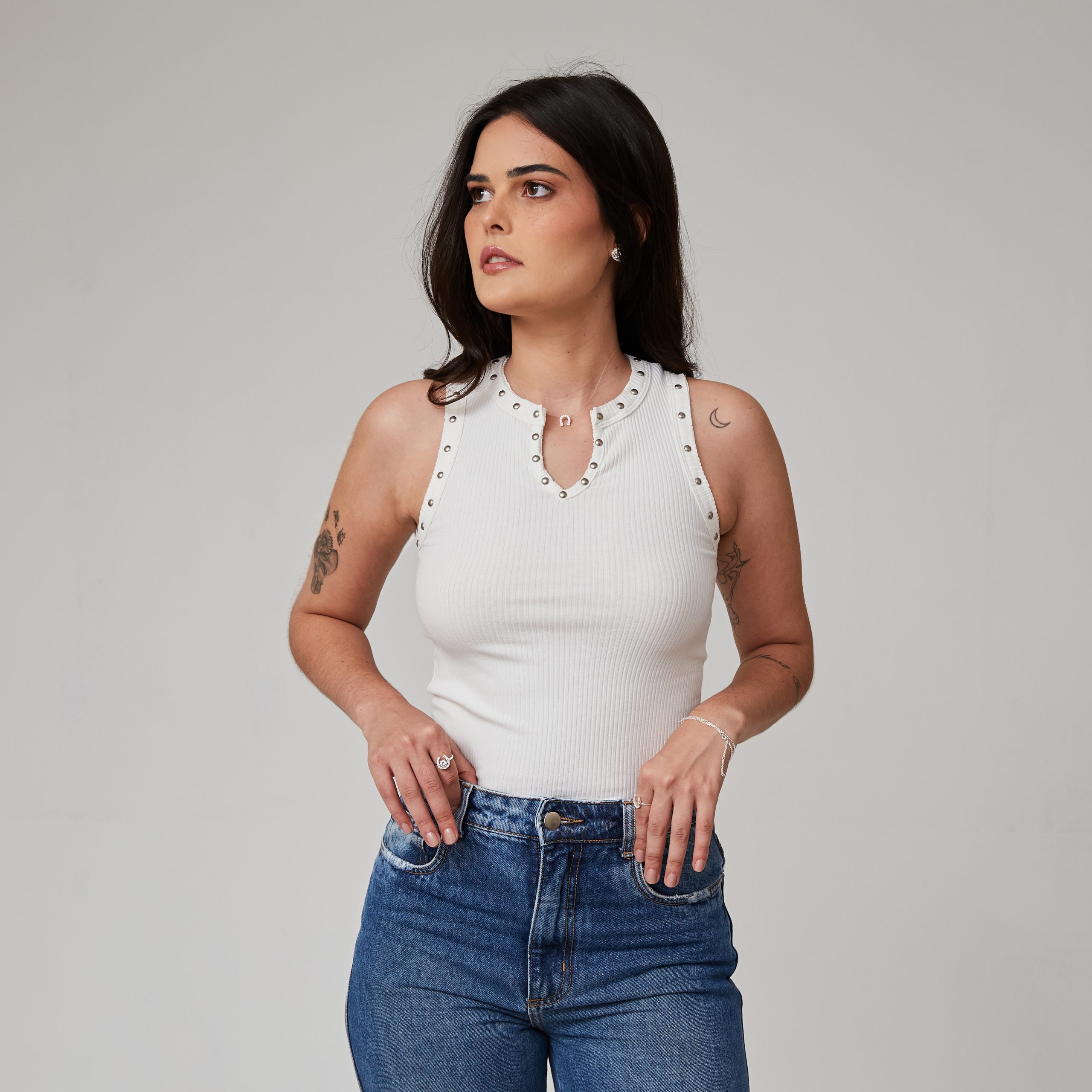 Regata modelo shape slim, decote em V e aplicações em tachas que dá um diferencial na peça