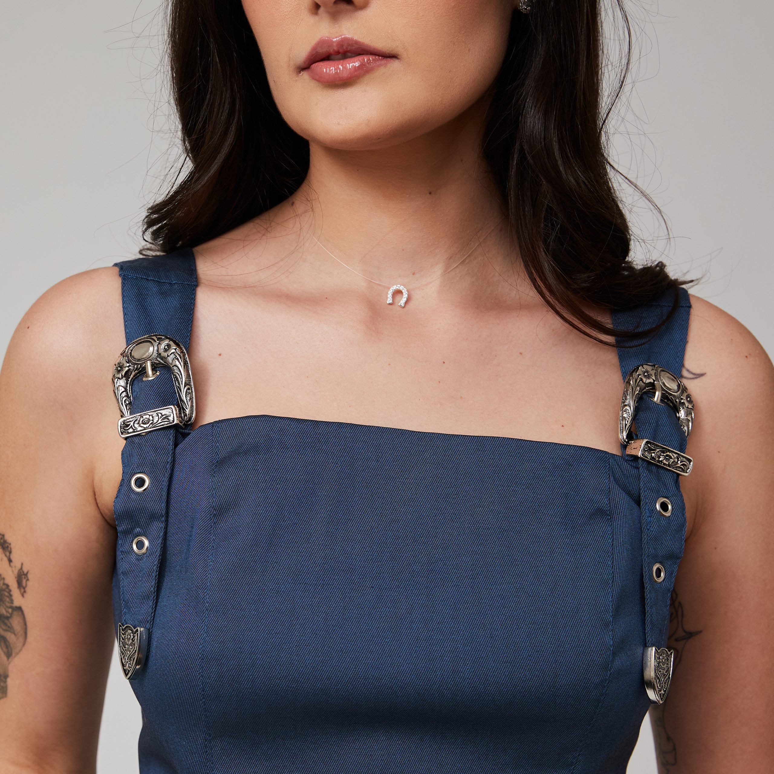 – Blusa com a modelagem mais curta; – Possui lastex e zíper metalizado nas costas; – Tecido duplo; – Detalhe com ajuste de fivela. Tecido: sarja…
