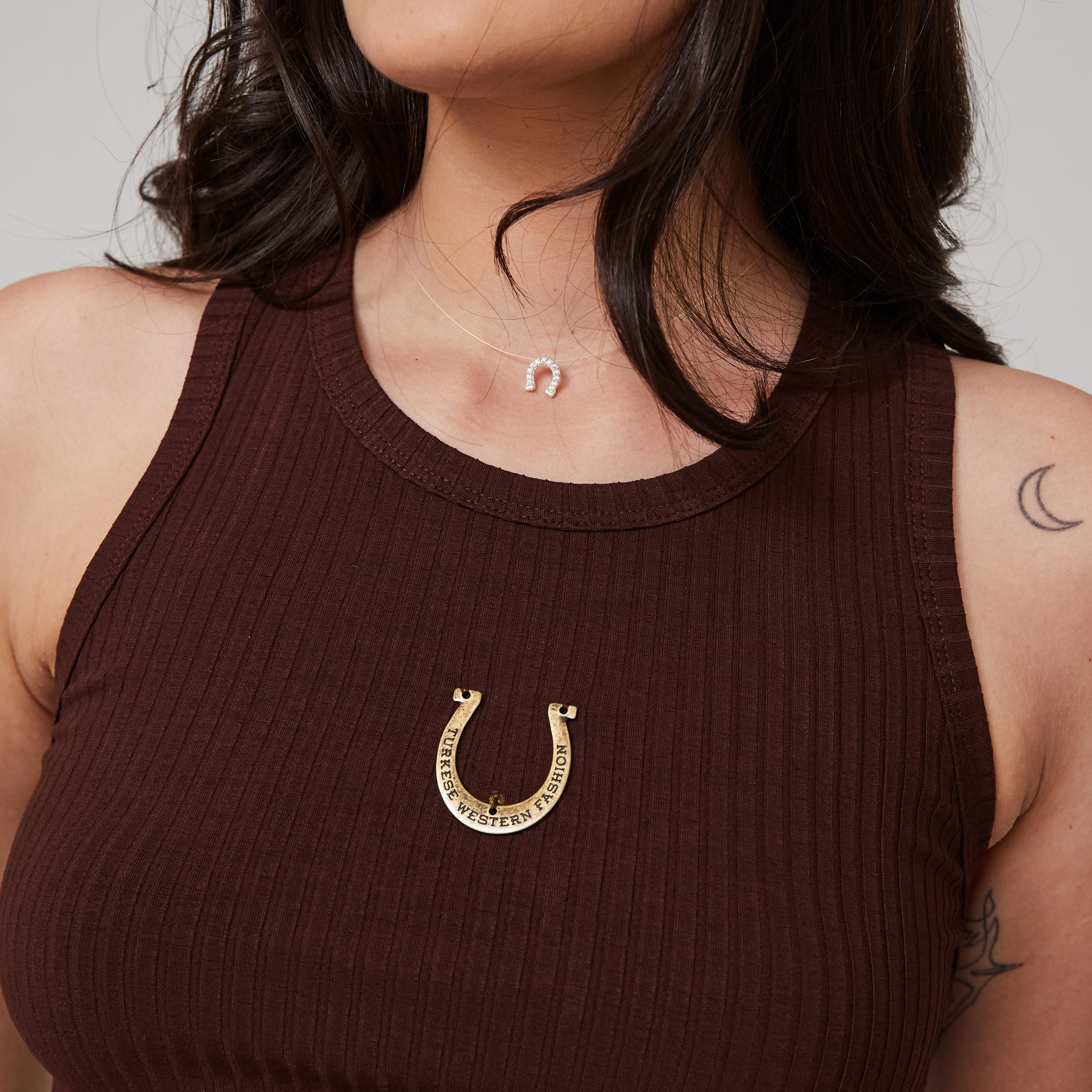 Regata com a modelagem mais justa, shape slim, decote redondo e aplicação de ferradura em metal Zamac
