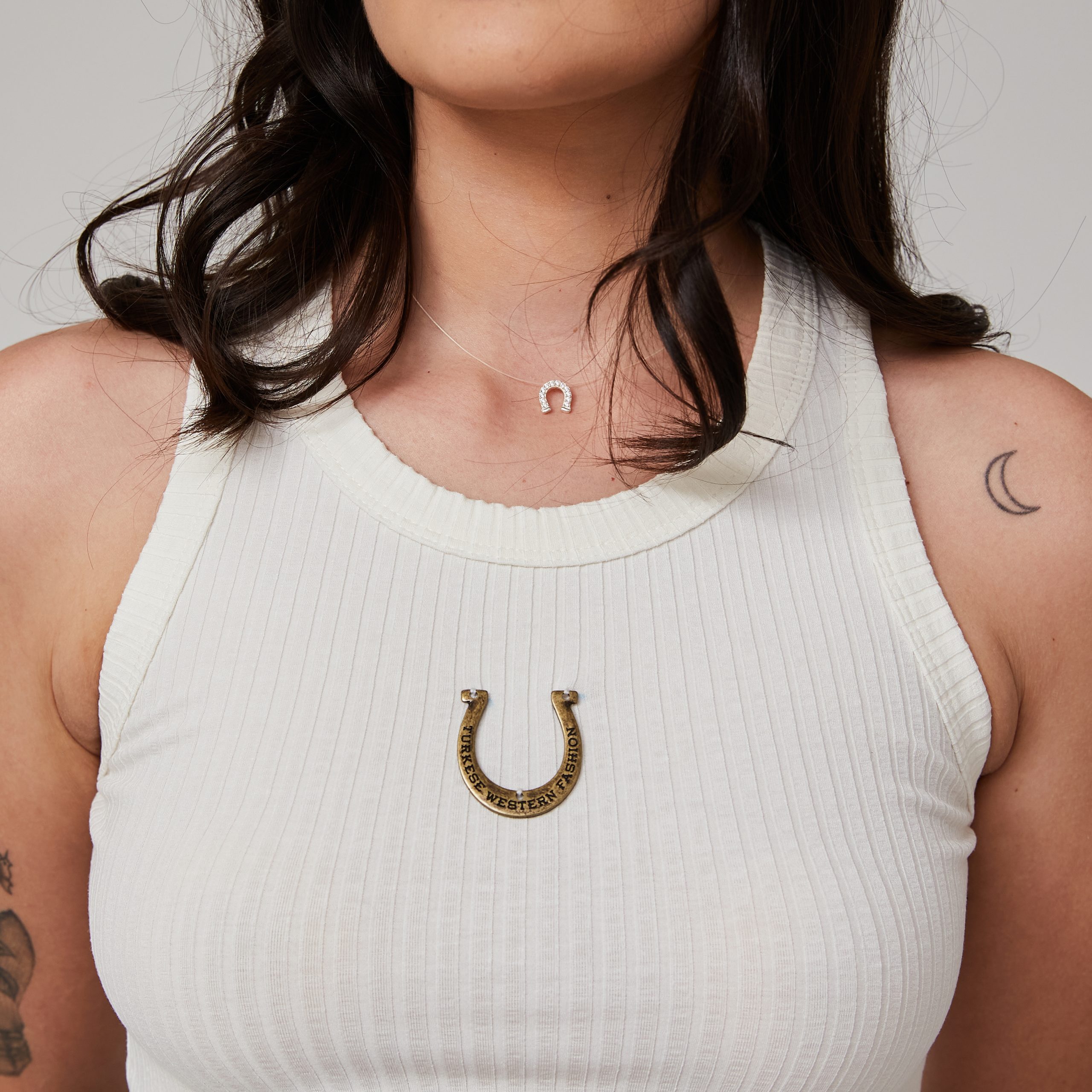Regata com a modelagem mais justa, shape slim, decote redondo e aplicação de ferradura em metal Zamac
