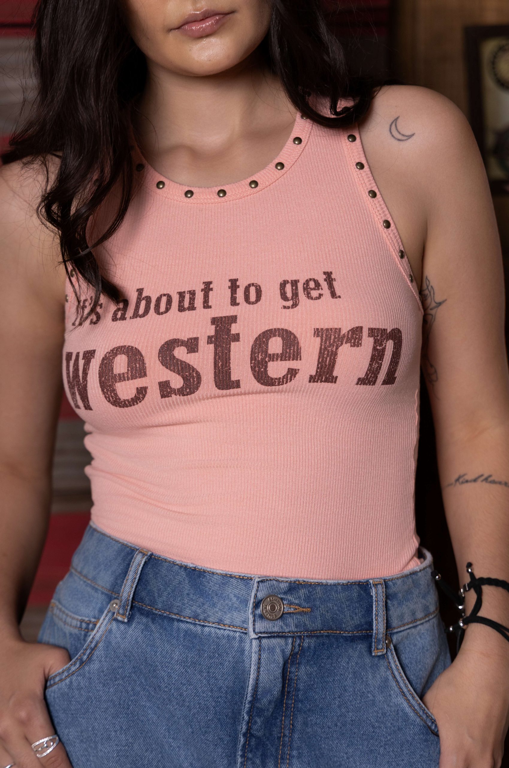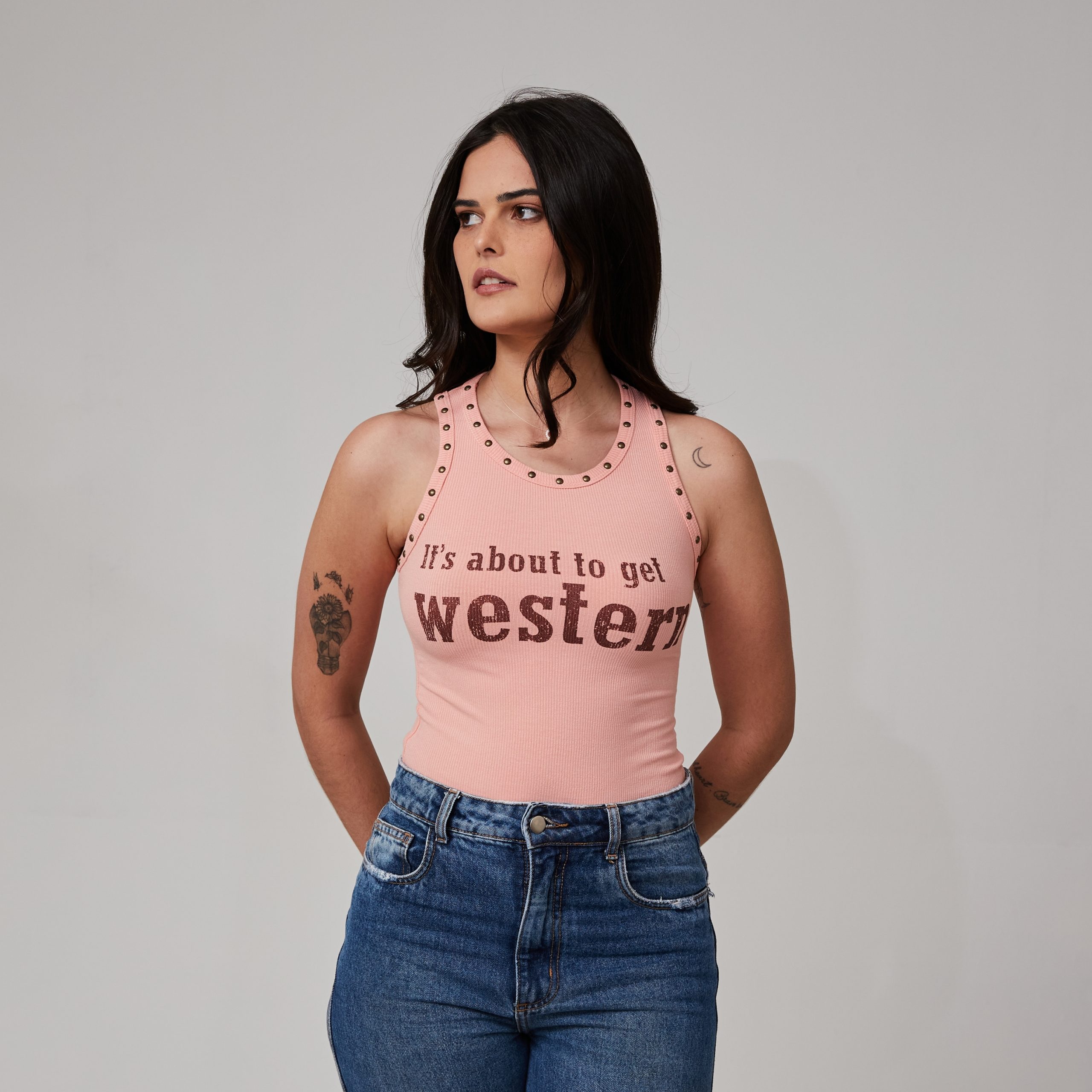 Regata em malha canelada modelo shape slim, decote redondo, estampa em silk e aplicação de tachas na gola e nas cavas.
