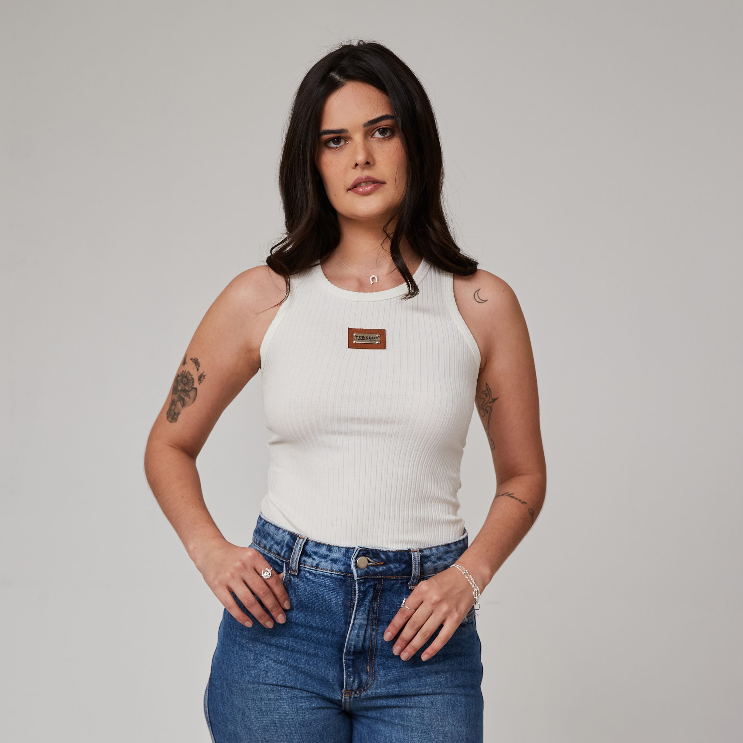 Regata em malha canelada com modelagem justa, shape slim, com aplicação de patch com logo marca na parte frontal.
