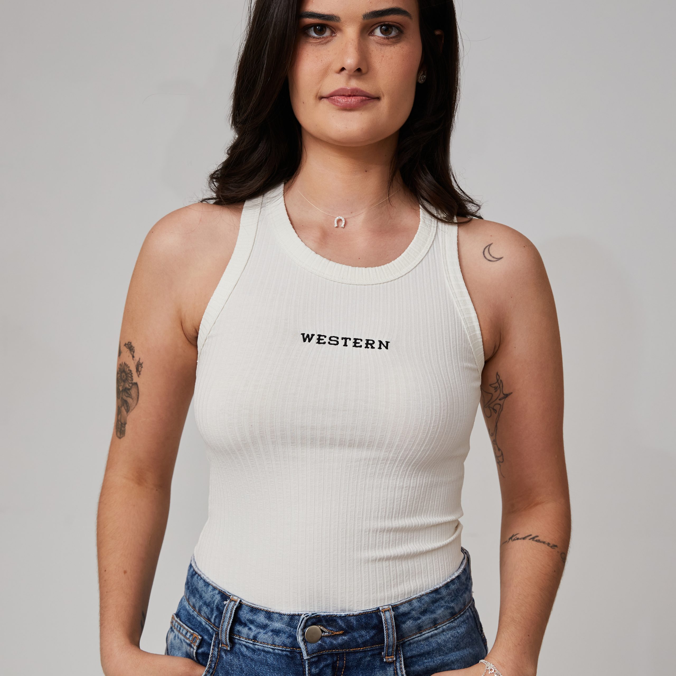 Regata em malha canelada com modelagem justa, shape slim, com aplicação de patch com logo marca na parte frontal.