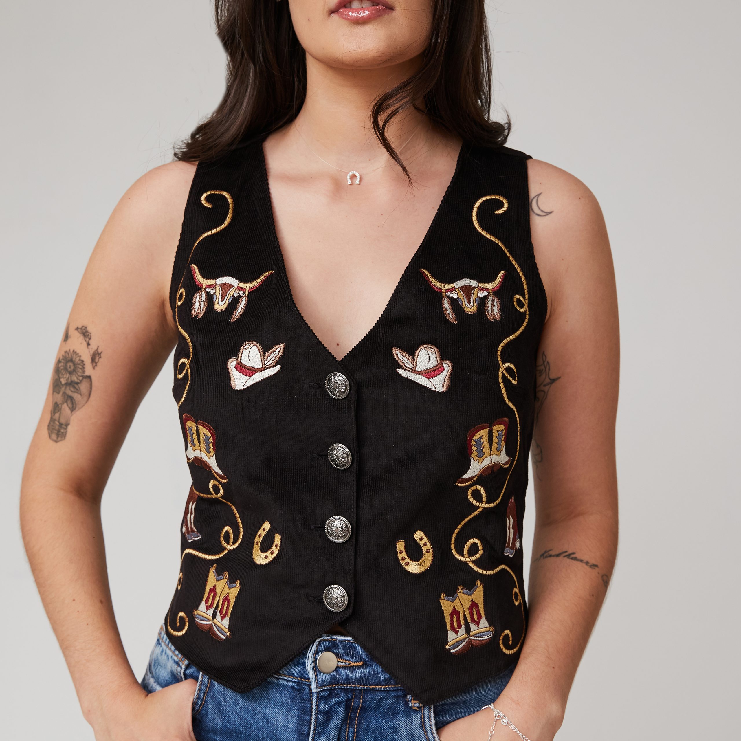 Colete em veludo cotelê com bordado frontal, fechamento em botão e tecido duplo para maior estrutura. Tecido: 97% algodão | 3% elastano Modelo veste tamanho…
